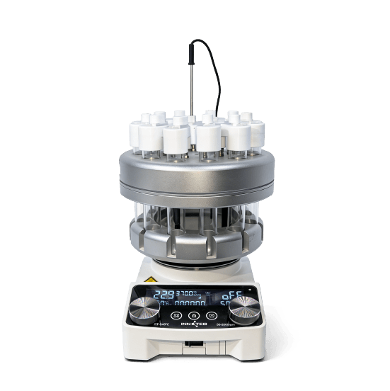 EasySyn-12 Plus位于WM-1磁力搅拌器上,可同时加热至室温至180°C的12次反应,精度为±2°C。通过WM-1的Pt1000温度传感器实现更高的精度。Pt1000温度传感器允许用户通过模块温度或溶液温度进行控制。将温度传感器插入铝基座或通过盖子直接插入反应溶液中。